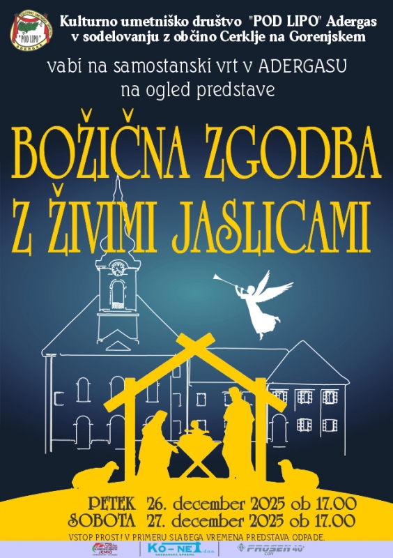 Po letu premora nas bodo v letošnjih prazničnih dneh ponovno razveselile žive jaslice – Božična zgodba, ki nas bo popeljala v skrivnost svetega večera. Uprizorili jo bodo člani KUD "Pod lipo" Adergas.